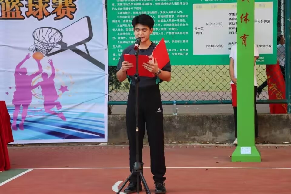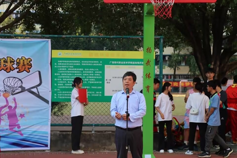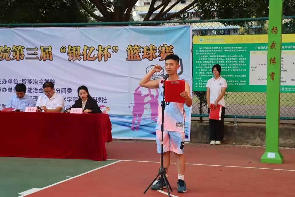 10月31日下午,智能冶金学院2023年第三届“银亿杯”篮球赛开幕式在篮球场上举行,广西银亿新材料有限公司副总经理、工会主席章群宏、人力资源部经理刘美强、品管部化验室主任李品碧受邀参与篮球赛开幕式,学校校长助理、智能冶金学院党支部书记骆伦彪、院长雷玉办、党支部副书记韦利余、副院长蓝光泽、副院长王岩出席篮球赛开幕式,智能冶金学院全体教师、班主任、辅导员和全体同学参加本次开幕式。23化工1班辛芳雨同学主持开幕式。