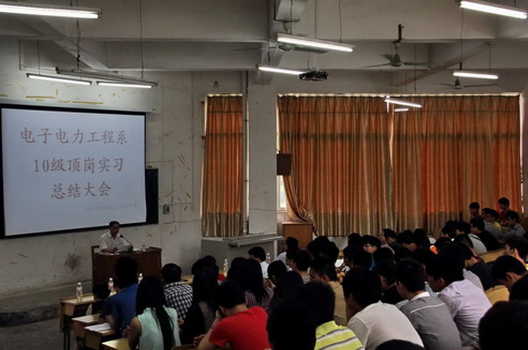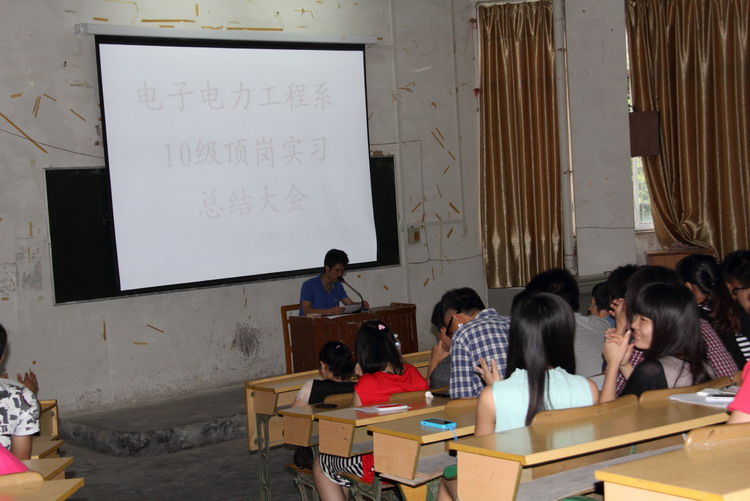 电子电力工程系讯 2013年6月27日15时,我系于学院第一阶梯教室召开10级顶岗实习总结大会,出席本次会议的有中科雅图信息技术有限公司黄总经理、何经理、系党总支书记韩锐老师、系主任兰建扬老师、副主任颜增显老师、各毕业班辅导员、班主任、系10级全体同学以及11、12级部分学生代表。