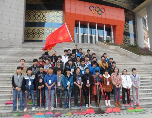我系在辅导员罗皓老师的带领下将雷锋精神延伸到了校外,以“践行核心价值观,志愿服务我先行”为主题的志愿服务,学生会全体成员自带劳动工具精神抖擞地前往体育馆开展志愿打扫活动。