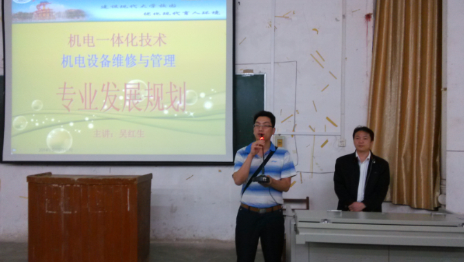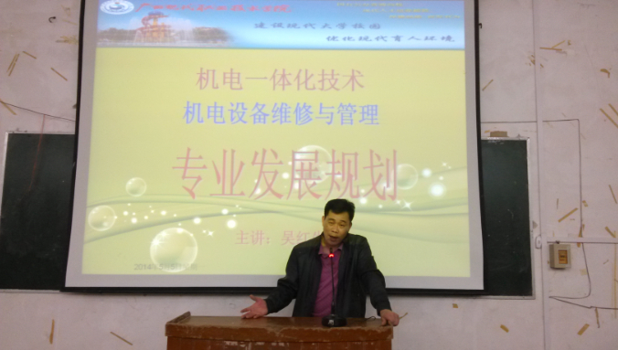 机电工程系讯(归达俊) 为了引导学生主动制定比较全面久远的发展计划,对当下就业与发展局势和未来整体性、长期性、基本性问题的思考和考量。5月5日晚8:00我系在第一教学楼第一阶梯教室举办了由吴红生老师主讲的机电一体化、机电设备维修与管理专业学生职业发展讲座。出席此次讲座的领导有院长助理、系主任韦建军副教授、党总支副书记李和明老师以及罗皓、祁道林、曾常乐、莫凡骁老师。