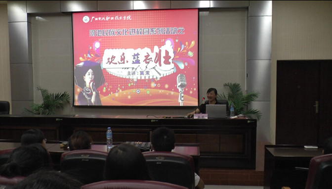 经济管理系、教育系讯 2014年6月16日晚,河池民族文化走进校园系列活动之一的“欢乐蓝衣壮”专题讲座在学院第一学术报告厅举行。本次讲座邀请了莫茉老师主讲。莫茉老师在音乐创作、编曲等专业领域内具有独特的建树,可以出口成歌。