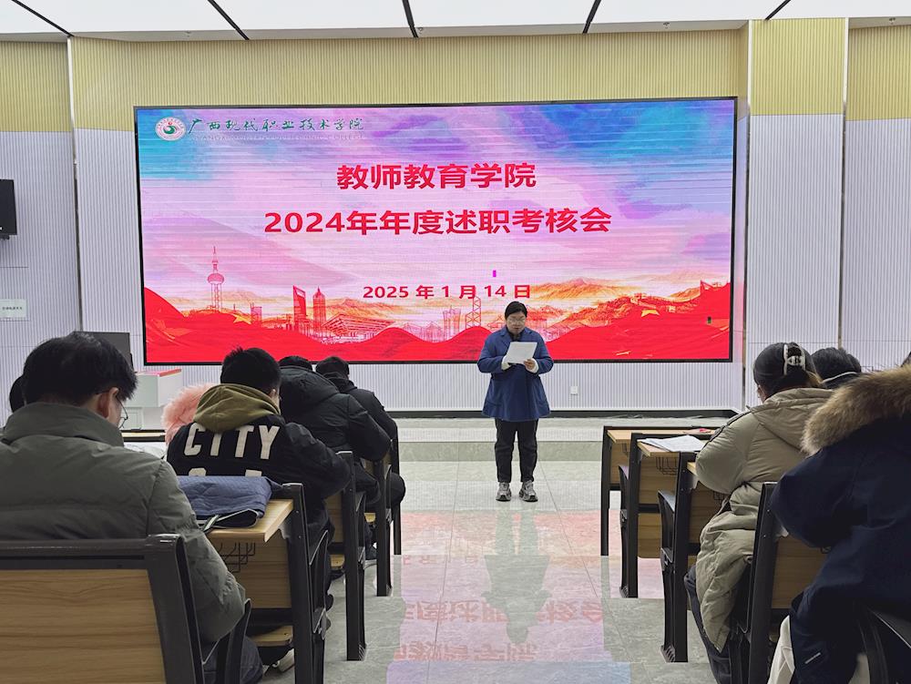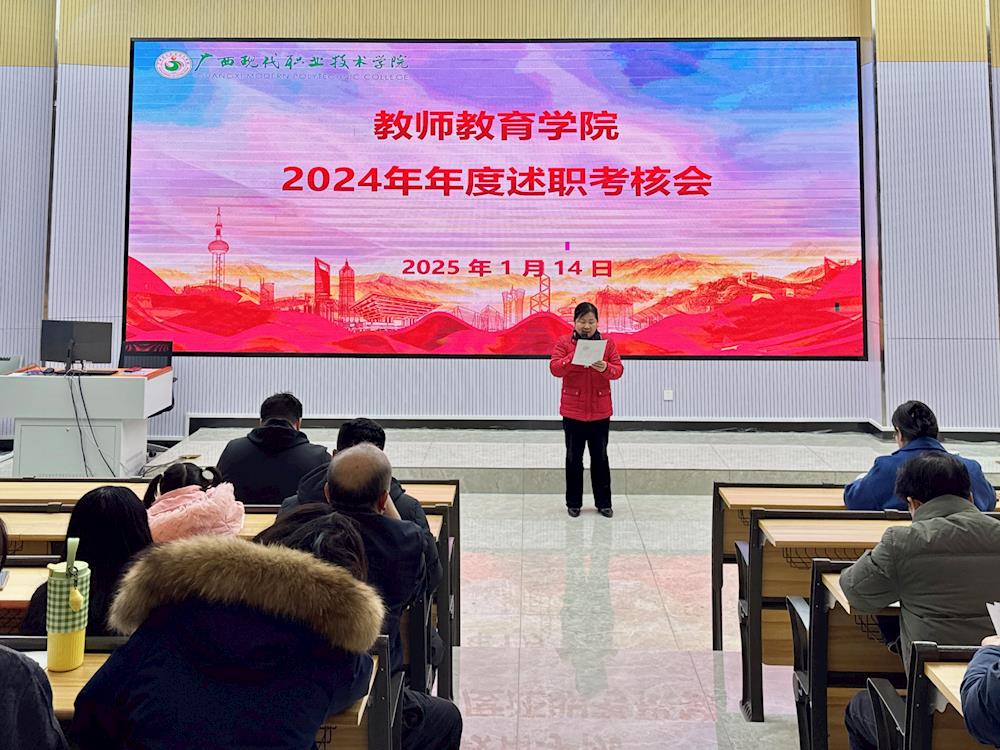 会议分为三个阶段进行。第一阶段,以教研室为单位开展述职考核,学院领导深入各教研室,听取专任教师汇报了2024年度在教学、科研、社会服务等方面的履职工作情况、存在的不足及原因、下一年的整改措施等。第二阶段,全体中层领导、行政人员及辅导员向全体教职工述职。第三阶段,全体教职工根据《中共广西现代职业技术学院委员会中层干部考核办法》及《广西现代职业技术学院职工考核评价实施办法》,对领导班子成员、行政人员及辅导员进行了现场不记名打分测评。