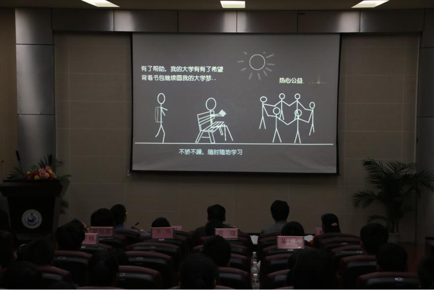 本次演讲比赛在奏唱国歌中开始。先是由受资助学生代表14汽修3班李冰同学发言;其次13位选手依次上台进行演讲。有些选手讲述自己在收到大学录取通知书后因为家庭贫穷而极有可能失去继续升学的机会,正是因为受益于国家助学贷款等有关政策才有机会来到大学校园。选手们亦或压抑的情感,亦或激昂的情绪感染了听众,赢得听众的阵阵掌声。