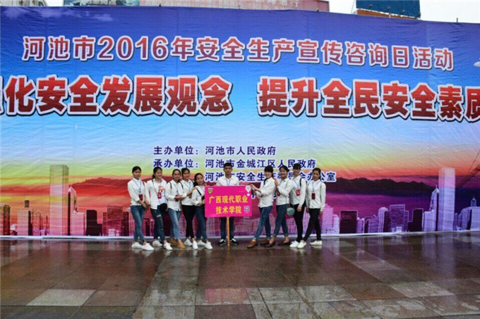 为进一步普及安全生产法律法规知识和安全常识,提高全民安全生产意识和素质,6月16日,河池市人民政府在文化广场举行2016年“安全生产月”安全宣传咨询日活动,我系10名学生代表参加了此次活动。