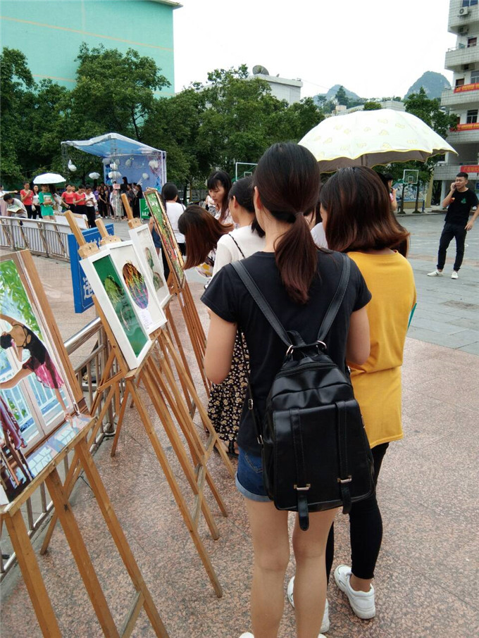 6月15日,教育系学前教育专业16学前6班、16学前7班作品展在学院喷泉广场开展,韦海宏老师组织16学前17班、16学前18班到场观展。