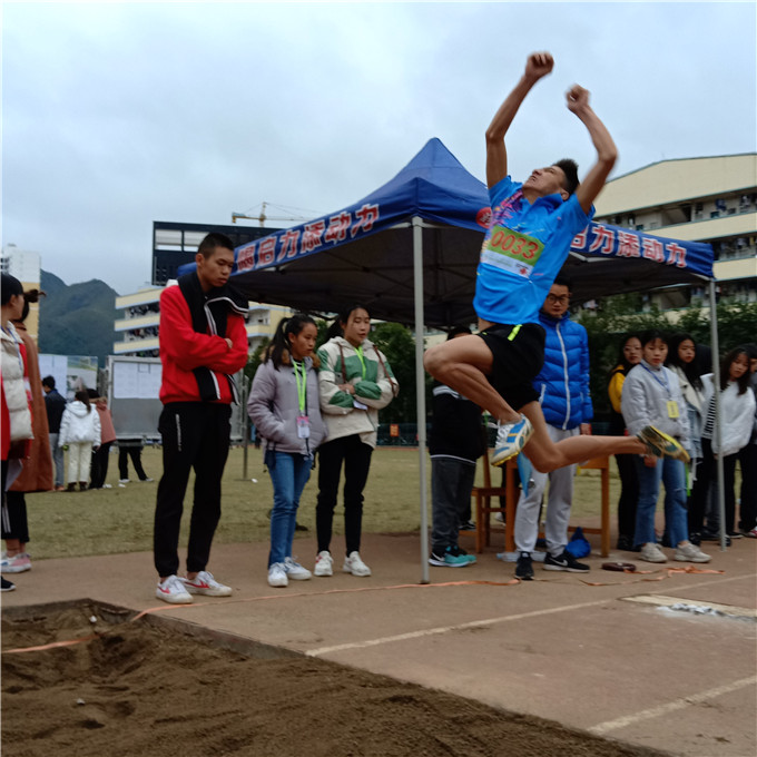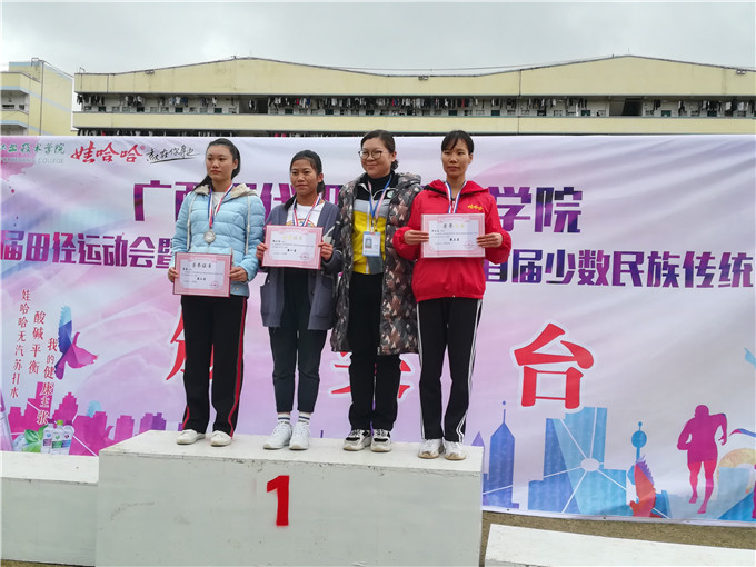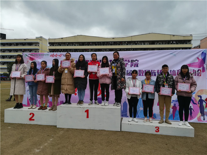 女子跳高:17学前12班覃燕清、18学前衔接6班滕冬辉、18小教13班覃娟海分别荣获第一名、第二名、第四名。