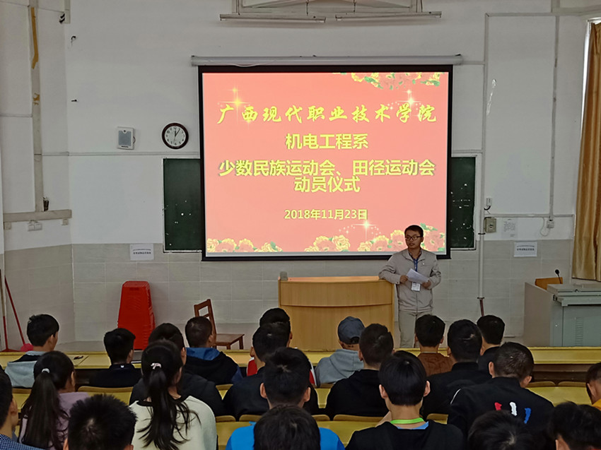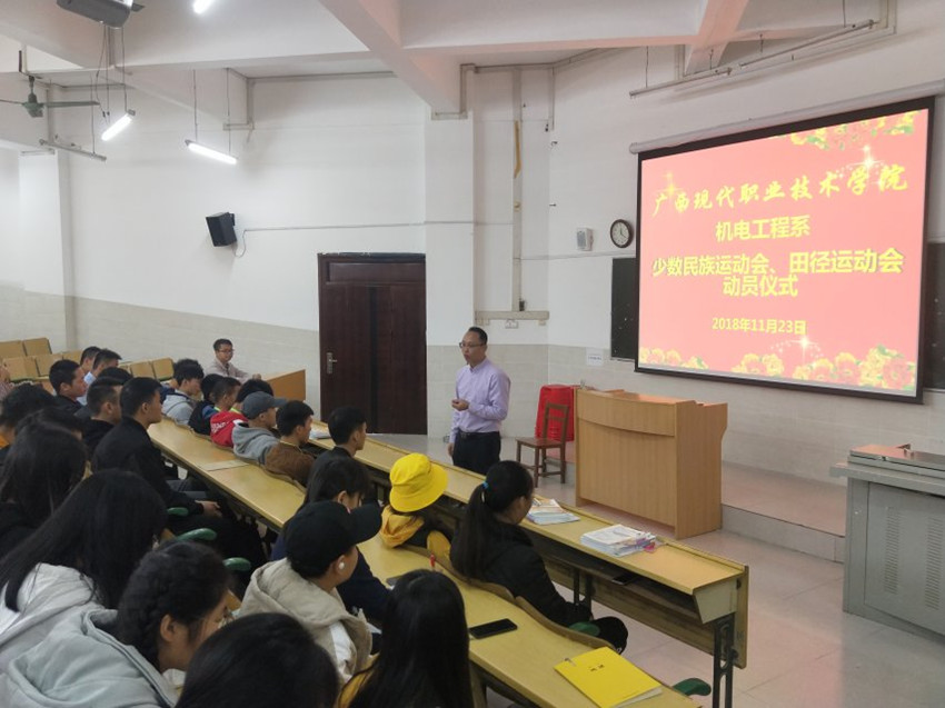 机电工程系少数民族运动会、田径运动会动员仪式 机电工程系讯 2018年11月23日中午12点,广西现代职业技术学院运动会机电工程系动员会在学院一教一阶教室举行。机电工程系党总支书记黄仕珍及机电工程系团总支书记牙举锋出席了本次会议,我系全体参赛运动员参与会议。 会议上牙书记向同学们介绍了我系在去年校运会上取得的好成绩,希望同学们今年可以再接再厉。还指出学生会的同学要做好后勤保障工作,服务好运动员,提前准备好训练器材,确保运动们能够按时训练,接着选出相对来说比较有经验的同学担任小组长,每天带领并组织大家一起训练。训练是艰苦的,但也一定是有意义的,所以,希望每个运动员能以最饱满的热情,昂扬的斗志参与本次比赛,也希望各相关人员可以携手共进,共创辉煌。随后是黄书记发表重要讲话,希望同学们可以保持去年的好成绩,并在此基础上有所进步,相信凭借同学们的实力一定可以取得好成绩。并预祝本届运动会我系取得优异的成绩。 此次动员大会的召开,使运动员们明确了目标,以饱满的热情和高扬的斗志整装待发,为我系在各项体育赛事上再创新辉煌奠定了基础。希望全体运动员和筹备人员鼓足干劲,振奋精神,为我系再创辉煌而拼搏。(文\图 李梦飞)