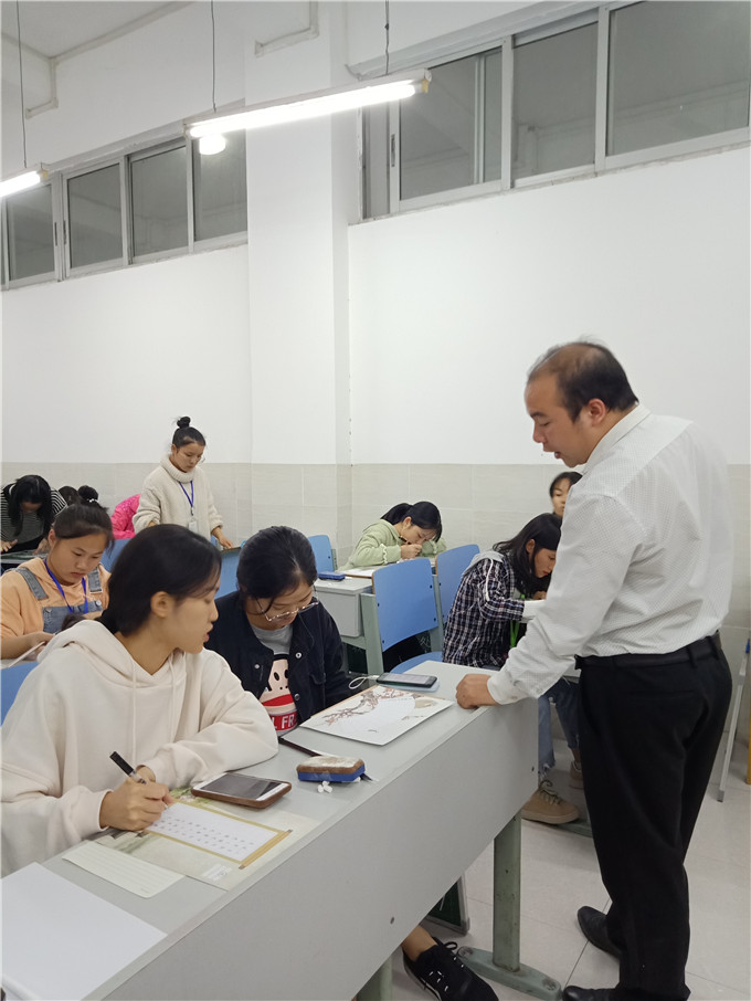 比赛时长共两小时,具体时间分配由选手自定,选手们坐姿端正,认真书写,凝神静气,现场井然有序。他们的作品有的娟秀婉约,有的大气舒展,有的端正整齐,充分展现出我系学生扎实的专业技能。