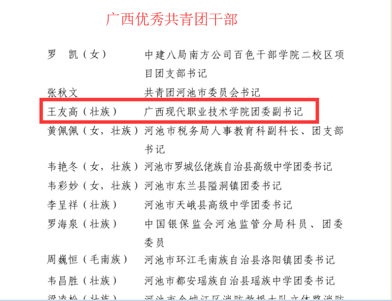 2019年,我系团建工作成效显著。在刚发布的《广西共青团 广西青年联合会关于表彰广西共青团先进个人和先进集体的决定》(桂青联发〔2020〕4 号)文件中,机电工程系党总支荣获“广西五四红旗团总支”荣誉称号;我系班主任、团委王友高副书记荣获“广西优秀共青团干部”荣誉称号;我系18机器人衔接2班苏梁倩同学荣获“广西优秀共青团员”荣誉称号。热烈祝贺获奖的集体和个人!希望受表彰的集体和个人,珍惜荣誉,再接再厉,再创佳绩。