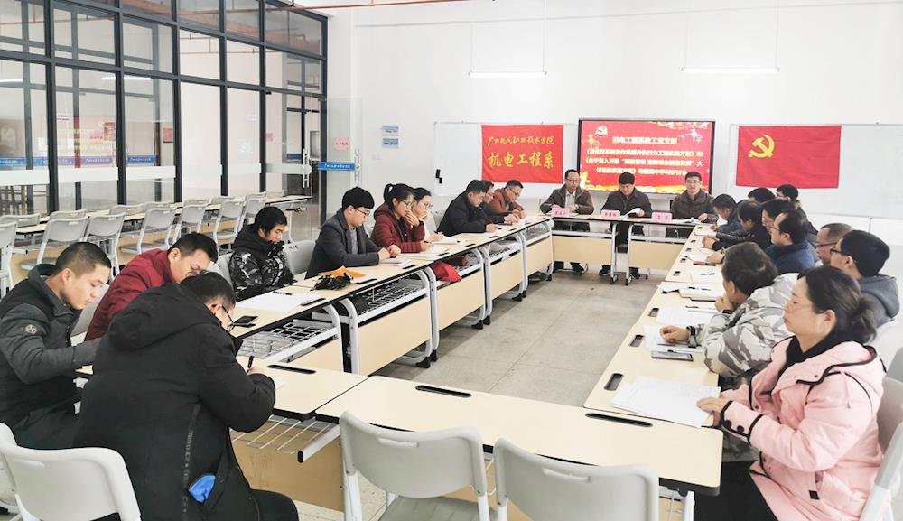 机电工程系党总支于1月14日下午15:10—18:00,对学院“两个方案”进行了深入解读、领会、学习;1月15日上午8:30—12:00,在昨天下午学习的基础上,继续对“两个方案”进行了专题集中学习研讨,学院党委韦伟松书记莅临指导。专题集中学习研讨会上,部门班子领导、全体党员、教研室主任,均结合部门和个人工作实际,认真查摆在政治素养、思想观念、工作作风和执行力方面存在的问题,并进行逐一发言,开展了第一阶段的解放思想大讨论。最后,韦书记做重要讲话。