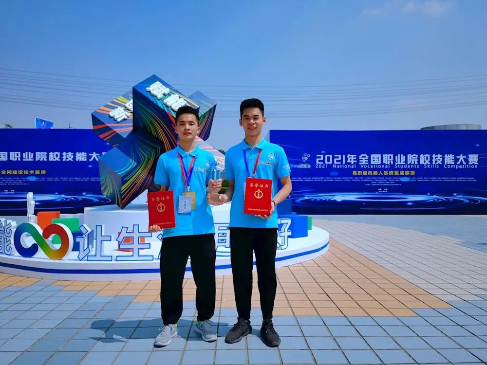 正逢庆祝建党一百周年之际,2021年5月21日晚,经过两天的激烈角逐,由教育部举办的2021年全国职业院校技能大赛“机器人系统集成”赛项,在山东济南圆满落下帷幕。我院代表广西出战国赛,在机电工程系岑华主任和指导教师涂翔宇、岑土恩的带领下,参赛选手18机器人衔接2班潘路和廖远杨同学不畏强手,努力拼搏,与来自全国27个省、自治区、直辖市的冠军代表队,共54名选手们同台竞技,最终以总分排名第二的好成绩斩获该赛项全国一等奖。这是我院夺得2019年全国职业院校技能大赛“工业机器人技术应用”和“制造单元智能化改造与集成技术”赛项双料冠军后的再一次夺魁!