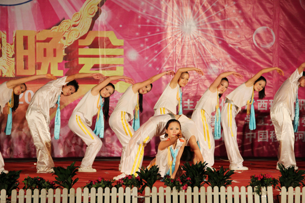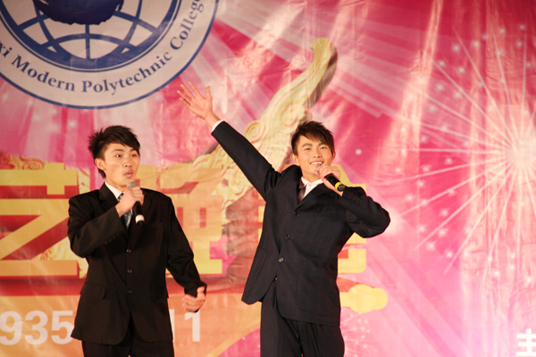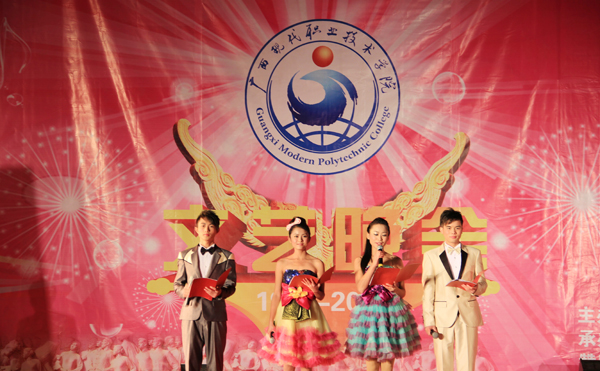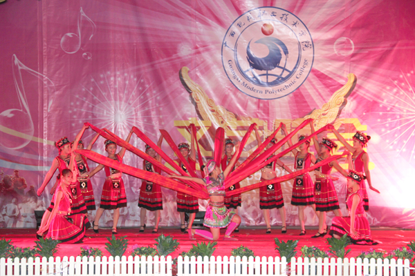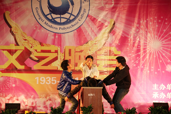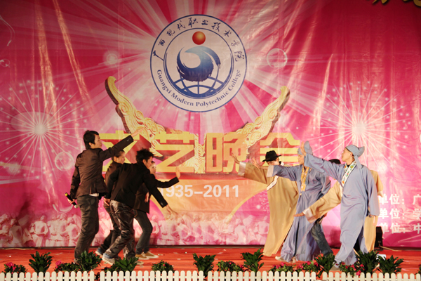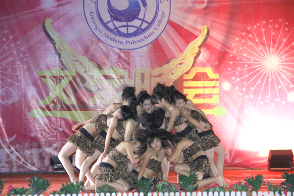 接着,晚会在随后的时间里,高潮迭起、异彩纷呈。先是由计算机工程系同学们带来富有民族韵味的舞蹈表演《黄河,大海》,柔美的舞姿与高亢的歌曲的完美结合,掀起类晚会的帷幕。之后节奏欢快的啦啦操《青春律动》、优雅柔美的舞蹈《生命交响曲》、动感十足的街舞《地板上的青春》、动听优美的女生合唱《听你说》、调侃风趣的哑剧《神医》、娓娓动人的流行歌曲联唱《毕业了》、俏丽动感的现代舞《性感部落》、真功夫《武力四射》等节目,一次又一次地将本场晚会推向高潮。其中的哑剧《神医》、相声《我的大学生活》博得了台下观众热烈的掌声和笑声。男声独唱《一天一万年》则以其旋律优美的音乐、天籁之音般的浑厚歌声,营造出另一番美妙醉人的诗境。晚会在民族舞蹈《春暖花开》中成功落下帷幕。整台晚会现场气氛热烈,节目形式多样,内容丰富多彩,赢得现场阵阵掌声。整台晚会节目精彩纷呈,高潮迭起,荡气回肠,观众掌声哨声不断,度过了一个广西现代职业技术学院的激情之夜。