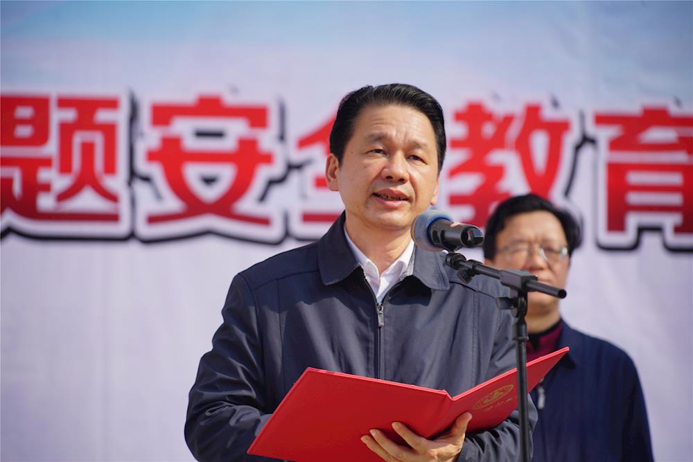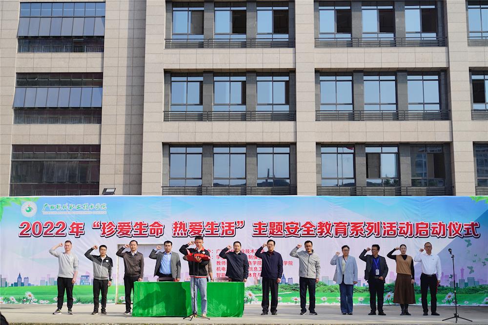 为深入贯彻落实自治区教育厅关于持续深入开展校园安全专项整顿工作部署,进一步增强广大师生安全防范意识,切实做好学校各项安全管理工作,有效预防和杜绝安全事故发生,确保学校财产和全体师生的人身安全,4月19日下午,我校在田径运动场举行2022年“珍爱生命 热爱生活”安全教育系列活动启动仪式。学校党委副书记、校长黄绍光,副校长卢森焕,校长助理、党委宣传部部长曾严,校长助理、智能冶金学院党支部书记骆伦彪等校领导出席仪式,学校相关部门、各二级学院党支部书记、师生代表参加启动仪式。仪式由学生工作处处长黄仕珍主持。