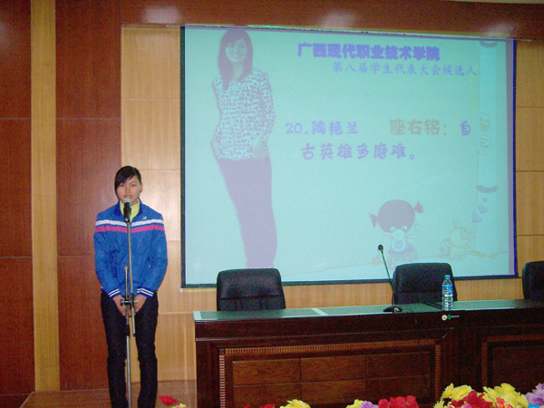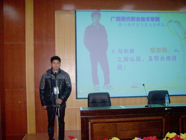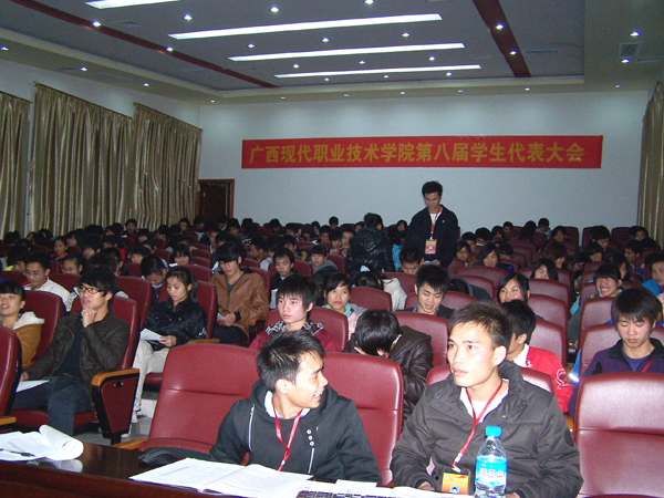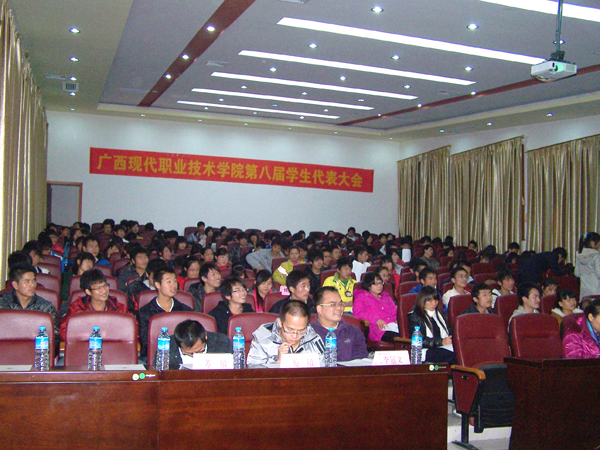 院党委宣传部、学工处讯(李铃 莫春燕) 2011年12月22日晚,广西现代职业技术学院第八届学生代表大会在学院第一学术报告厅召开,选举产生新一届的学生会成员。来自全院各系、院团委、学生会及兄弟院校的166名代表和特邀代表参加会议,学工处处长霍江华、副处长李铃以及学院团委副书记李媛媛出席了大会。
