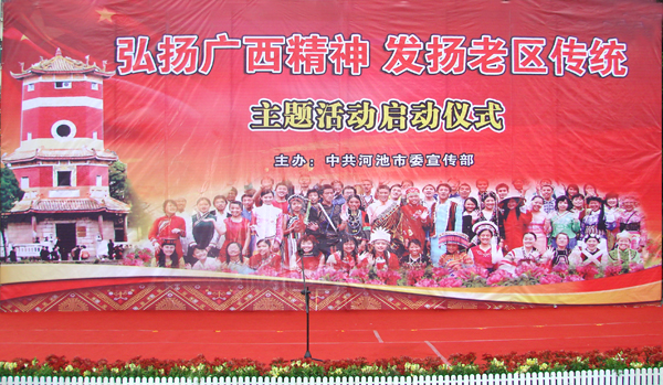 黎丽在启动仪式上强调,“团结和谐、爱国奉献、开放包容、创新争先” 的广西精神,是中华民族精神在广西的具体体现,同样也是河池老区精神、老区优良传统的体现。深入开展“弘扬广西精神,发扬老区传统”主题宣传教育活动,是推进社会主义核心价值体系建设的一项重要行动,对于提高河池文化自觉和文化自信,进一步增强河池文化软实力,提升对外吸引力,增强对内凝聚力有着重要意义。我们学习宣传弘扬广西精神,要与传承发扬老区革命传统结合起来,要切实践行广西精神,把广西精神融入到河池经济社会发展的各个领域、各个方面和全过程,在推进“五大工程”,实现富民强市新跨越中发挥好广西精神,凝聚全市人民的智慧和力量,推动各项工作“上档进位”。