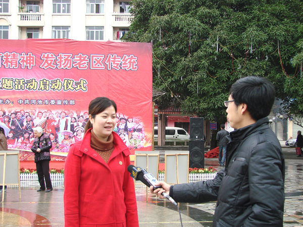 启动仪式结束后,我院管理工程系教师石林鑫接受了广西人民广播电台、河池电视台记者的采访。石老师说,河池市开展这项活动,可以让更多的干部职工、青年学生、各族群众了解广西精神的内涵,在工作、学习、生活中践行广西精神。我是广西现代职业技术学院的一名普通教师,一定会在工作中弘扬广西精神,发扬老区传统,刻苦钻研,认真教学,培养出更多的人才,为实现河池“富民强市”新跨越作出自己的贡献。