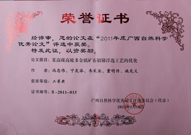 院党委宣传部讯(莫春燕) 2011年度广西自然科学优秀论文奖结果揭晓,我院副院长冯忠伟,教师宁发添、韦文业、董明传、施先义撰写的《某高碳高硫多金属矿石铅锑浮选工艺的优化》论文获二等奖。