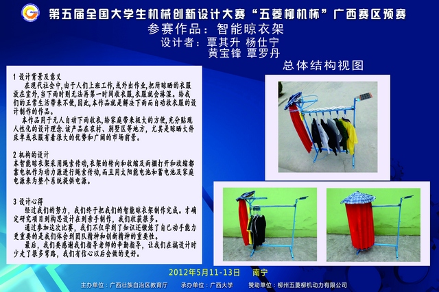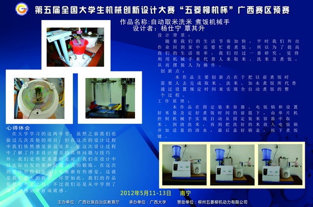 机电工程系讯(唐元继)2012年5月12-13日,全国大学生机械创新设计大赛广西赛区预赛在广西大学举行,全区共有126个作品参加比赛。我院选送的五个作品全部获奖。
