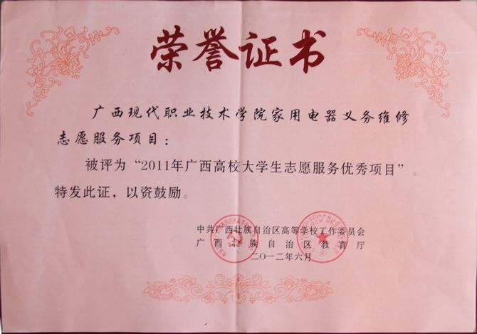 学工处讯 近日,广西壮族自治区高校工委、教育厅发布《关于表彰2011年度广西高校大学生志愿者年度人物、年度人物入围奖、优秀大学生志愿者标兵、优秀大学生志愿者和优秀大学生志愿者服务项目的决定》(桂党高工[2012]6号),我院大学生志愿者和志愿者服务项目在评选活动中喜获佳绩,廖建肆、庞丽萍、米德伦、林基华、杨鸿生五位同学荣获“2011年广西高校大学生优秀志愿者”称号,广西现代职业技术学院家用电器义务维修服务项目荣获“2011年广西高校大学生志愿服务优秀项目”奖项。
