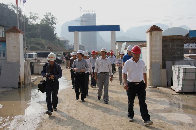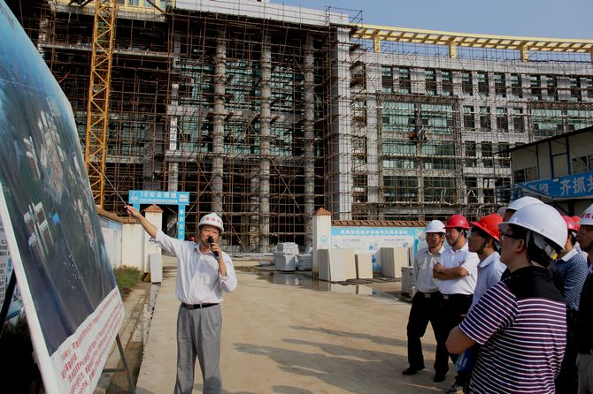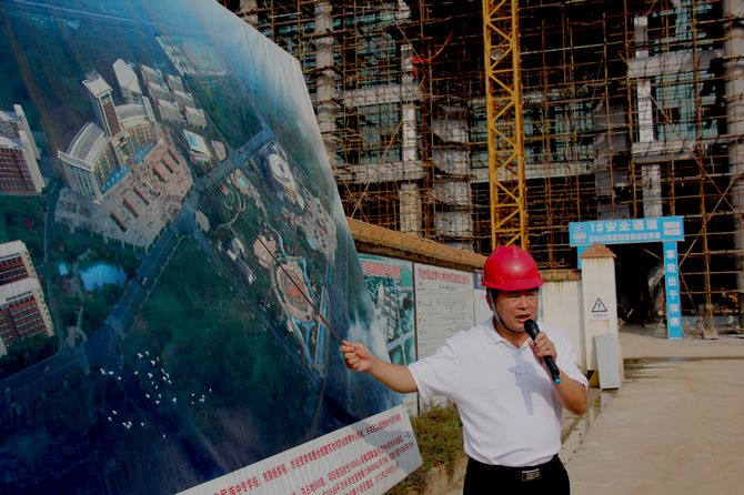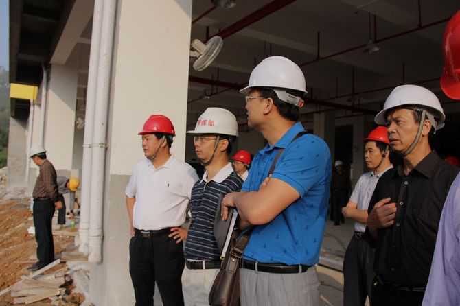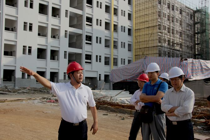 在职教中心学校领导、新校区建设工程指挥部领导的陪同下,考察团越过沙砾堆、走进建筑工地、爬上黄土坡,逐一考察了实验楼、驾驶培训中心、宿舍楼、食堂、教学楼等工程的施工建设情况,认真听取了基建负责人对项目施工基本情况的汇报。韦书记还亲自为考察团详细讲解了新校区整体规划方案及最新进展。在综合教学楼工地,韦书记引导大家下逐层察看了教室、报告厅的材质构造、通风取光和功能设置等情况,对新校区后续建设及交付使用等提出了指导意见。韦伟松书记对中秋、国庆节日期间奋战在建设一线的领导、职工给予高度评价,对他们无私奉献的精神表示肯定。