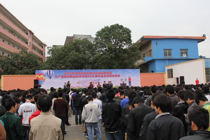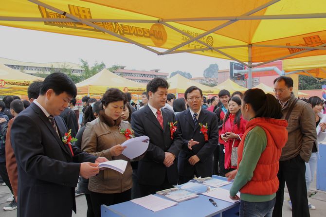 党委宣传部讯(曾严)2012年11月23日,由河池市人力资源和社会保障局、广西现代职业技术学院联合举办的2012年河池市高校毕业生就业服务周暨我院2013届毕业生校园双选会,在我院文体广场举行。河池市副市长韦祖林、学院党委书记韦伟松、河池市人力资源和社会保障局局长李凤云、河池市就业局局长韦振飞、学院副院长冯忠伟出席开幕式。开幕式由河池市人力资源和社会保障局副局长罗凤中主持。