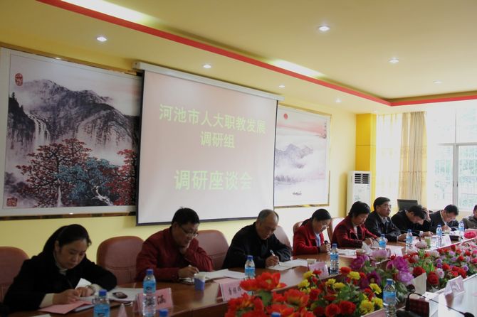 调研组深入我院进行了实地考察,并召开座谈会听取我院及河池市职业教育中心学校关于开展职业教育工作情况的汇报。我院党委书记,河池市职教中心党委书记、校长韦伟松也向调研组汇报了在职业教育施教过程中的一些具体措施、工作经验以及存在的问题和困难。调研组还就所关心的招生政策、校企合作、特色专业设置、政府资金投入等问题交换了意见。