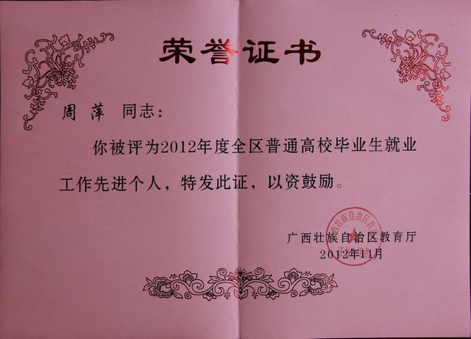 学院党委宣传部讯(曾严) 近日,根据自治区教育厅《关于表彰2012年度全区普通高校毕业生就业工作先进集体、就业统计先进单位和就业工作先进个人的通知》(桂教学生〔2012〕20号),我院招生就业办周萍副主任荣获2012年度全区普通高校毕业生就业工作先进个人。