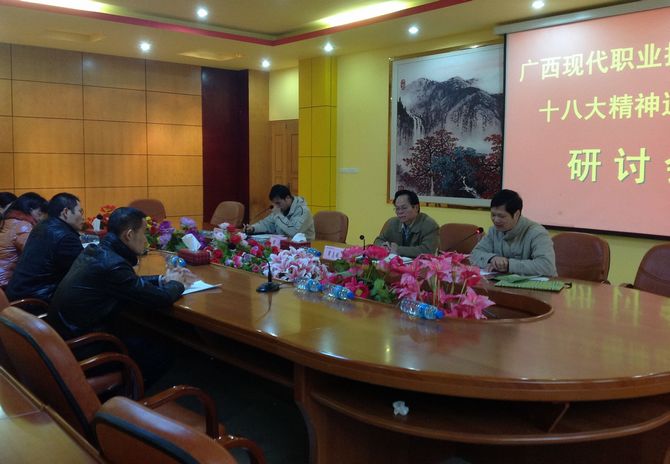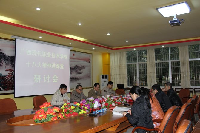 社科部讯 (韦朝忠文 游桂荣图) 2012年12月20日上午,学院党委在第一会议室举行“十八大精神进课堂”研讨会。研讨会由教科处副处长何启贤主持。
