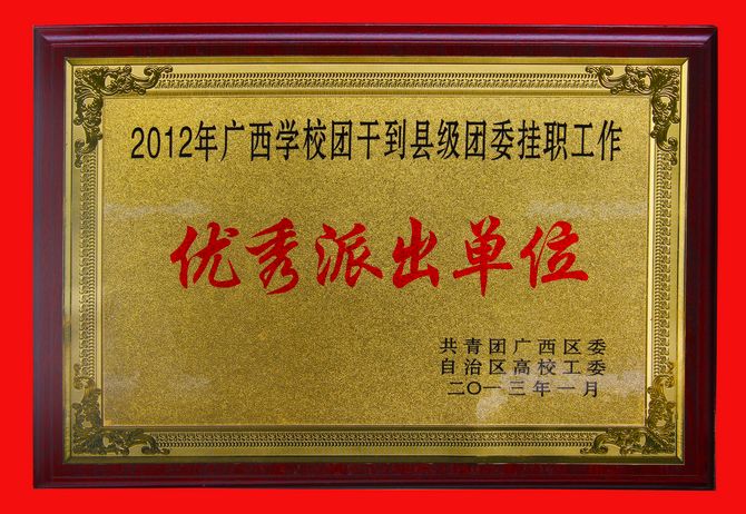 学院党委宣传部讯(曾严) 近日,共青团广西区委、广西高校工委联合下文,表彰2012年广西学校团干到县级团委挂职工作先进单位和先进个人,我院荣获“2012年广西学校团干到县级团委挂职工作优秀派出单位”称号。