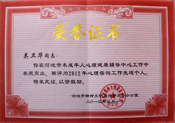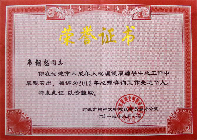 河池市文明办采用量化考核的办法,评选2012年度河池市未成年人心理健康辅导中心工作先进个人。我院大学生心理健康教育与咨询中心主任韦朝忠、心理咨询室主任吴卫华两位老师,因为积极参与河池市未成年人心理健康辅导中心的创建工作,并分别担任该中心的主任和心理咨询工作志愿者,在该中心的管理、咨询、服务等工作作出积极贡献,量化考核得分分别排在第一位和第四位,在28位志愿者中表现突出,因而荣获该荣誉称号。