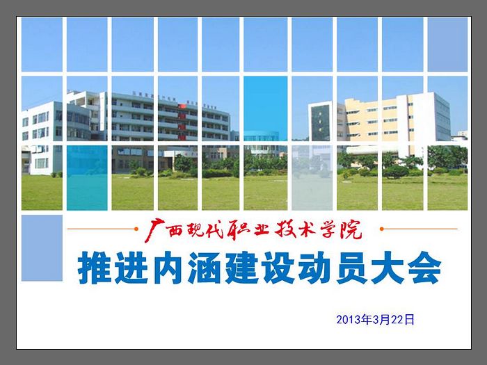 党委宣传部讯 今年是我院全方位打造内涵建设的攻坚年,为了更深入地开展学院内涵建设,实现“学院梦”,2013年3月22日下午,我院在第二学术报告厅召开了推进内涵建设动员大会。学院党委书记韦伟松,以及学院全体教职工参加了此次会议。会议由学院党委副书记、纪委书记覃志航主持。