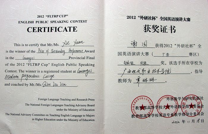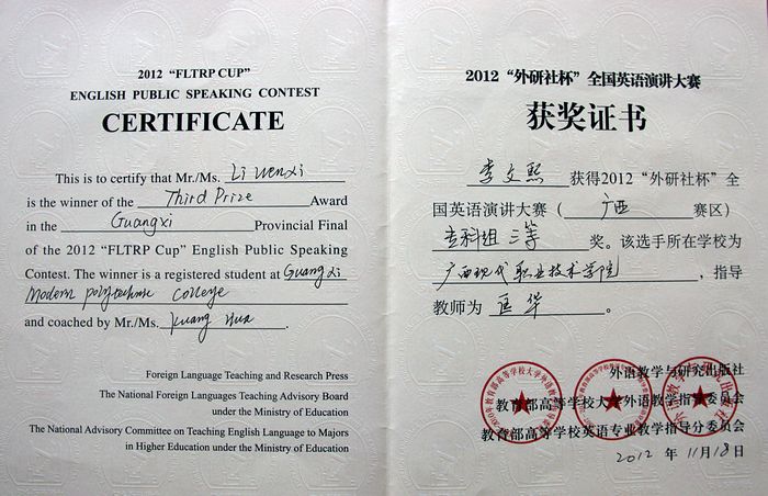 党委宣传部讯 2012年“外研社杯”全国英语演讲比赛广西赛区获奖结果已揭晓,我院选手李文熙和谢园两位同学在广西赛区决赛中发挥出色,分别荣获三等奖和优秀奖。