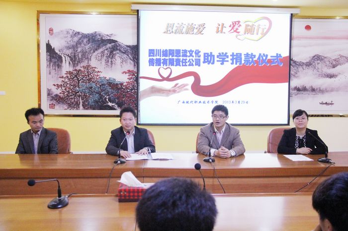 党委宣传部、学工处讯 2013年3月31日,四川绵阳恩流文化传播有限责任公司韦三鸿先生一行亲临我院参加助学捐款仪式。学工处相关负责人组织捐款仪式。