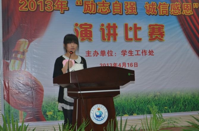 学院学工处讯 为宣传党的资助政策,教育同学们感恩党,感恩祖国,激发同学们立志成才的信念,拓宽同学们的知识面,2013年4月16日晚7:30,学院学生工作处在学院第二学术报告厅组织举行“励志自强,诚信感恩” 2013年全区高校资助演讲比赛选拔赛。