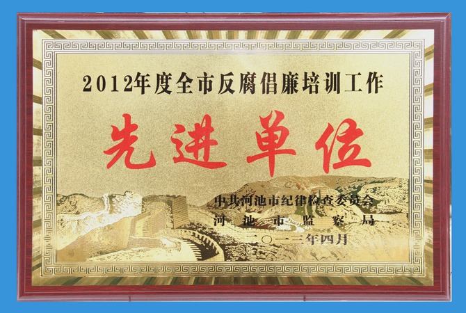学院党委宣传部讯(曾严) 近日,我院被中共河池市纪律检查委员会、河池市监察局授予“2012年度全市反腐倡廉培训工作先进单位”称号。