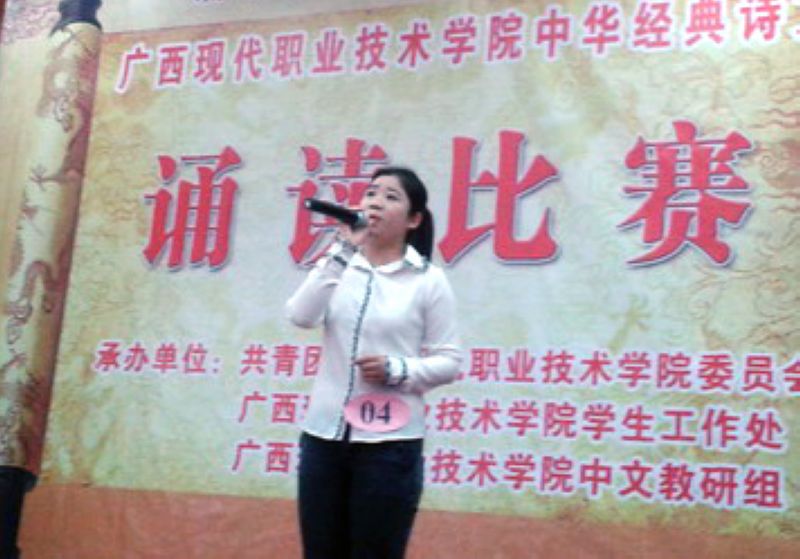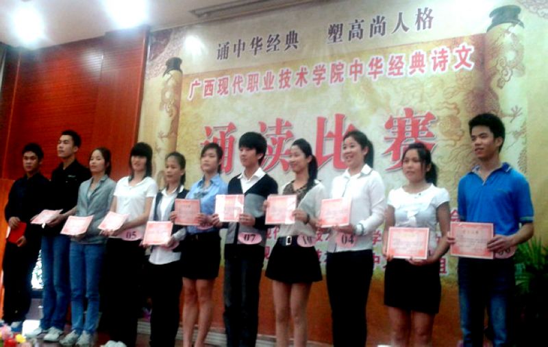 为传承和弘扬中华民族的优秀文化传统,培养团员青年们的爱国主义精神,2013年4月28日下午,学院团委、学生工作处和中文教研组在我院第二学术报告厅联合举行“诵中华经典,塑高尚人格”中华经典诗文诵读比赛,来自机电、电子、资源、建筑与信息工程、经济管理与教育等6个系的11名同学参加了比赛,300多名师生到场聆听选手的精彩诵读。