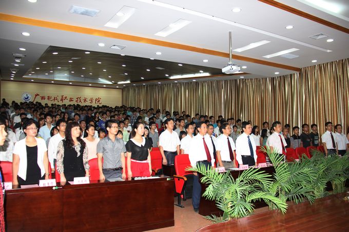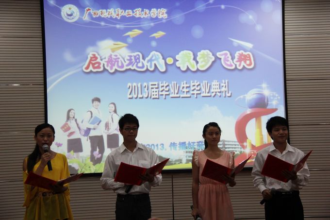 在庄严的国歌声中,毕业典礼正式拉开了帷幕。首先覃志航副书记转达了因出差未能出席毕业典礼的学院党委韦伟松书记对2013届毕业生的寄语:一对2013届毕业生如期完成大学学业表示祝贺,二对不能到场与大家告别表示歉意,三希望2013届毕业生珍惜母校情谊、师生情谊和同学情谊,牢记师长、校友、家长的期望和嘱托,在新的学习和工作岗位上,开拓进取、创业创新,不断取得优异的成绩,以报答父母的养育,回报母校和老师的教育和培养、回报祖国和人民,四预祝全体2013届毕业生事业有成,幸福安康,生活美满!
