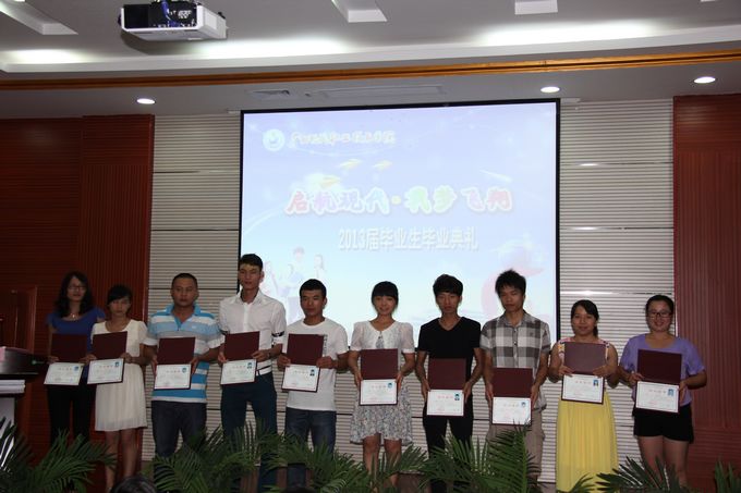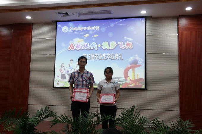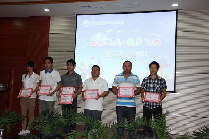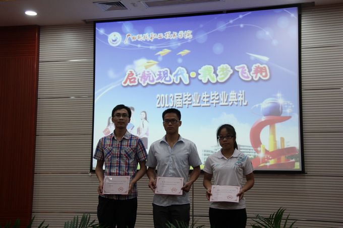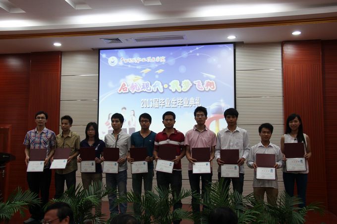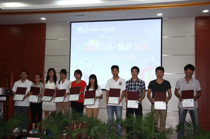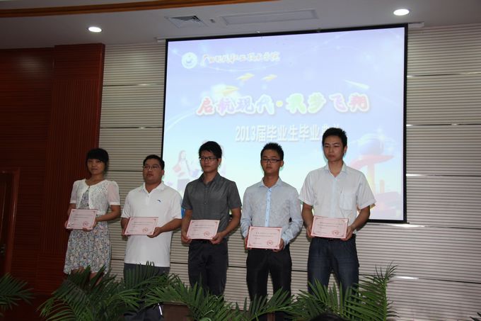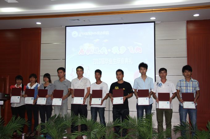 随后,冯忠伟副院长宣读了学院荣获2013届自治区级优秀毕业生的表彰文件,并给荣获“2013届自治区级优秀毕业生”以及“2012年度自治区三好学生”、“2012年度自治区优秀学生干部”、“2011年度广西高校优秀共青团员”、“2011年广西高校优秀大学生志愿者”等荣誉称号的毕业生颁发荣誉证书。紧接着进行颁发毕业证仪式,由出席毕业典礼的学院领导为50名毕业生代表颁发毕业证。