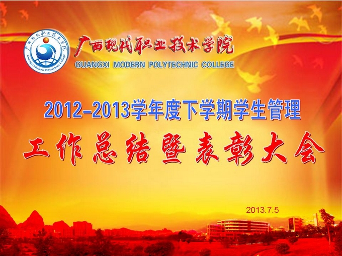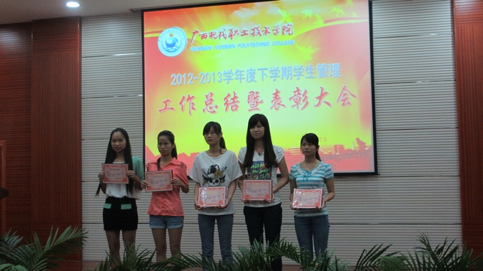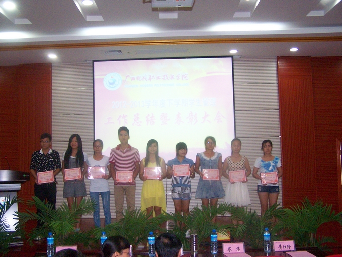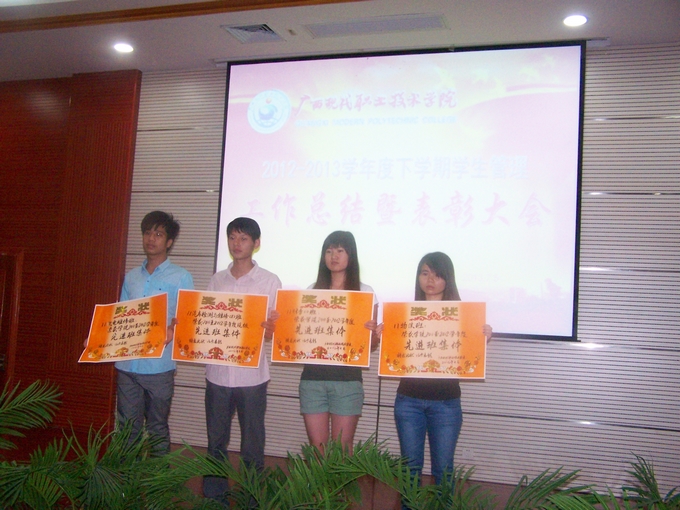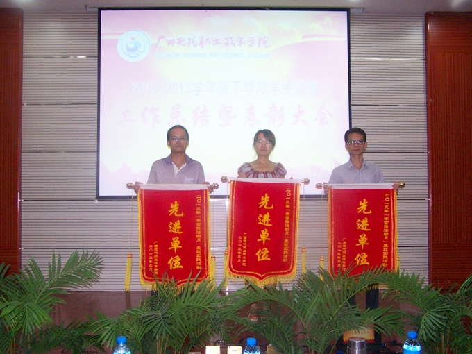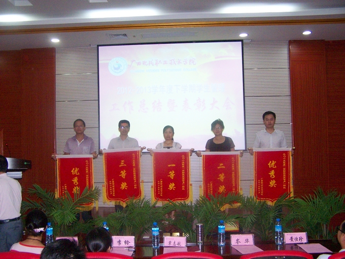 大会首先由学工处副处长岑华,学工处副处长李玲,学工处副处长、团委副书记黄仕珍分别作了2012--2013学年度下学期学生管理工作小结、学生资助工作小结、学生活动工作小结。随后,岑华副处长宣读了本学期我院受自治区、市、学院各级表彰的先进集体和先进个人名单。与会领导分别为荣获先进集体和先进个人颁奖。