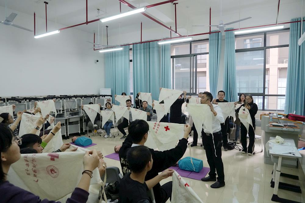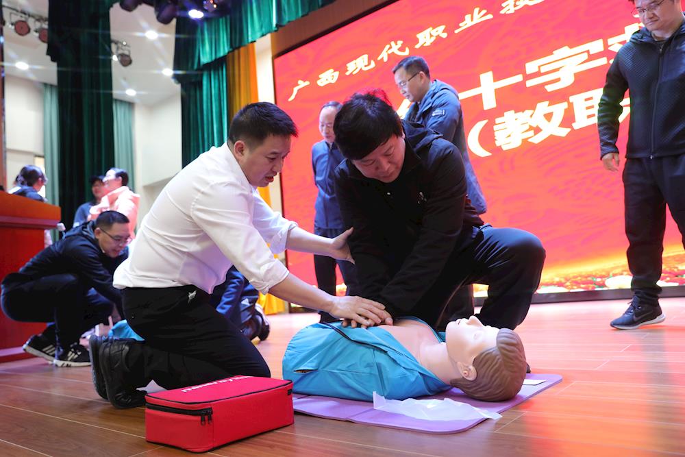 签约、揭牌仪式后,广西现代职业技术学院组织了320名教职员工开展了新一轮的红十字救护员持证培训。培训中,广西红十字会救护训练中心的培训师们通过幽默风趣的理论讲解,直观易懂的操作演示,以理论+实操的教学方式,详细示范、讲解了心搏骤停、心肺复苏、创伤救护及包扎等施救步骤和应急处理方法。此次培训后,该校教职工红十字救护员持证率已基本实现全覆盖。