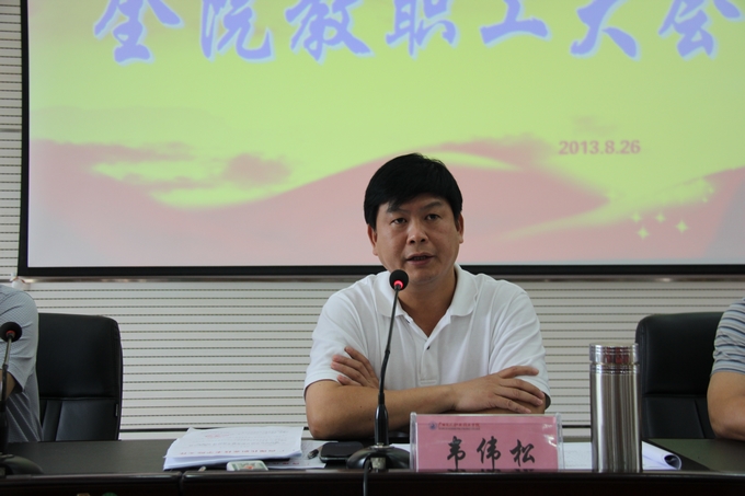 党委宣传部讯 8月26日上午,我院2013年秋季新学期全体教职工大会在学院第二学术报告厅举行。市委副秘书长、学院党委书记韦伟松出席大会并讲话。大会由学院党委副书记、纪委书记覃志航主持。