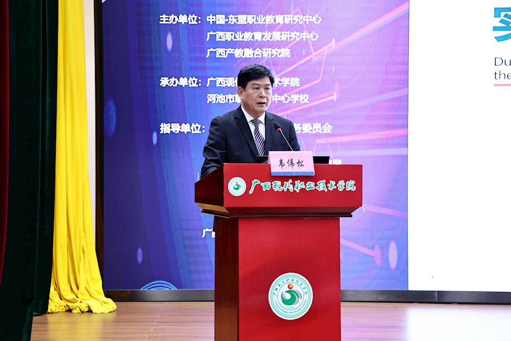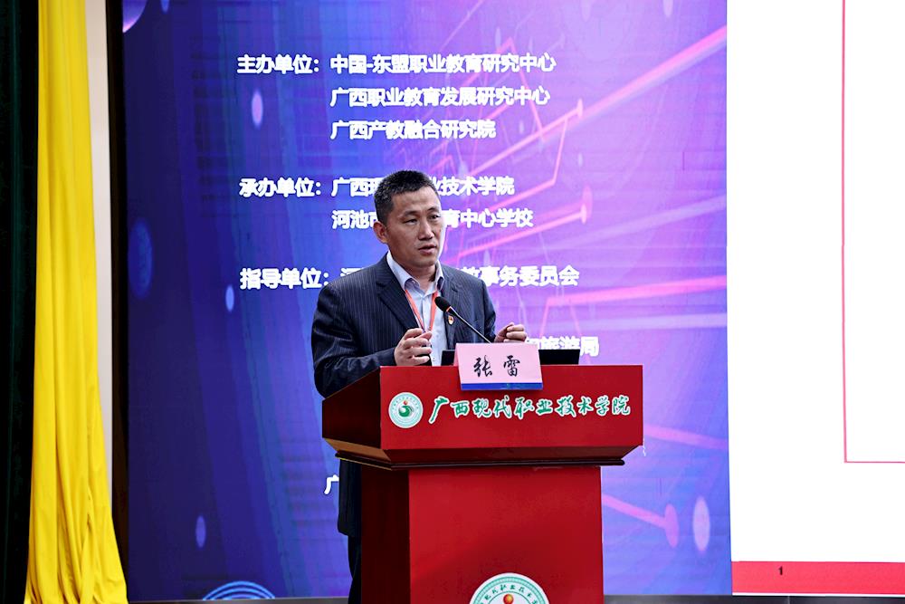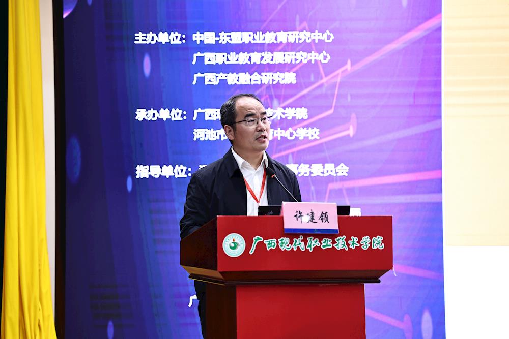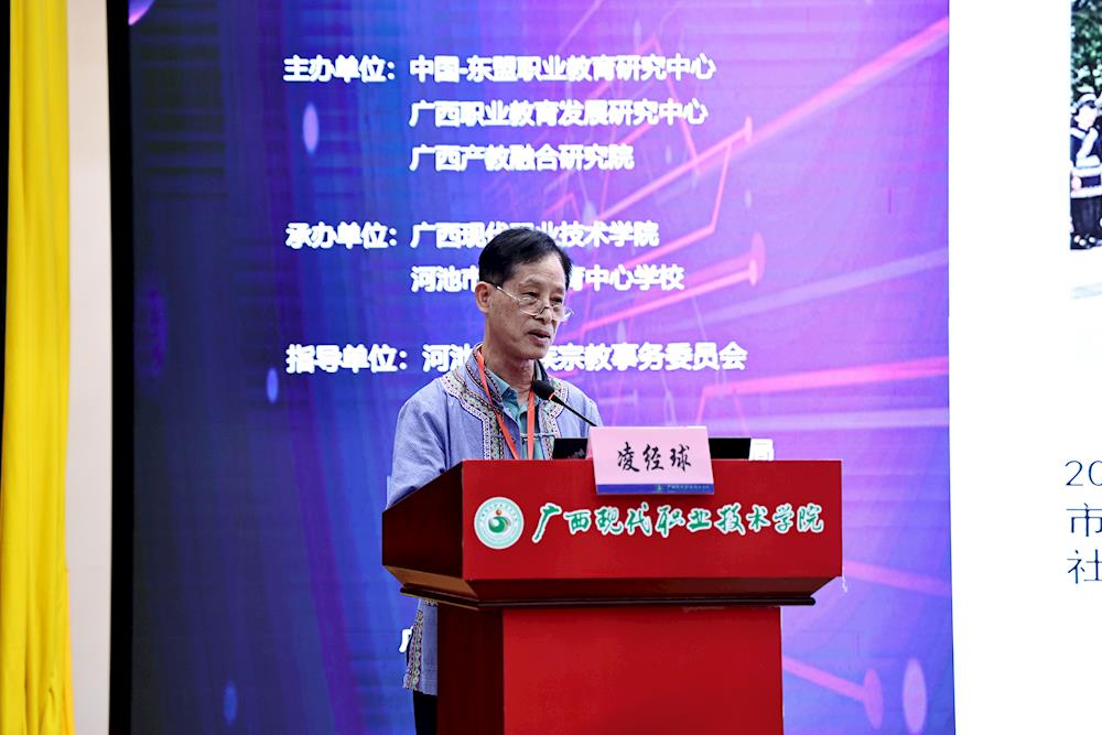 会上,教育部民族司原一级巡视员葛维威,中共广西区委党校、广西行政学院经济学教研部教授凌经球,中国高等教育学会职业技术教育分会会长周建松,广西社科院民族研究所所长、自治区党代表、人大代表覃娟作主旨报告;深圳职业技术大学校长许建领,河池市政协副主席、广西现代职业技术学院党委书记韦伟松,桂林旅游学院马克思主义学院党委书记、院长张雷作经验交流分享;中国职业技术教育杂志社常务副主编席东梅、广西机电职业技术学院党委书记黄小敬、乐山职业技术学院党委书记成定彬、重庆工业职业技术学院原书记王官成、深圳市第二职业技术学校校长王波、河池市职业教育中心学校党委书记黄丹峻在嘉宾沙龙进行交流。