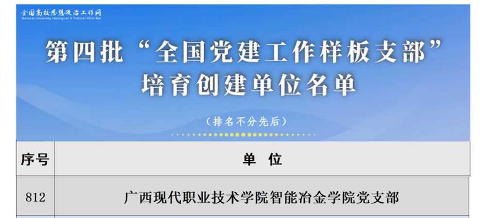 近日,教育部办公厅第四批全国党建工作示范高校、标杆院系、样板支部培育创建单位名单公布,广西现代职业技术学院智能冶金学院党支部获评“全国党建工作样板支部”培育创建单位,这是学校党支部首次获此殊荣。