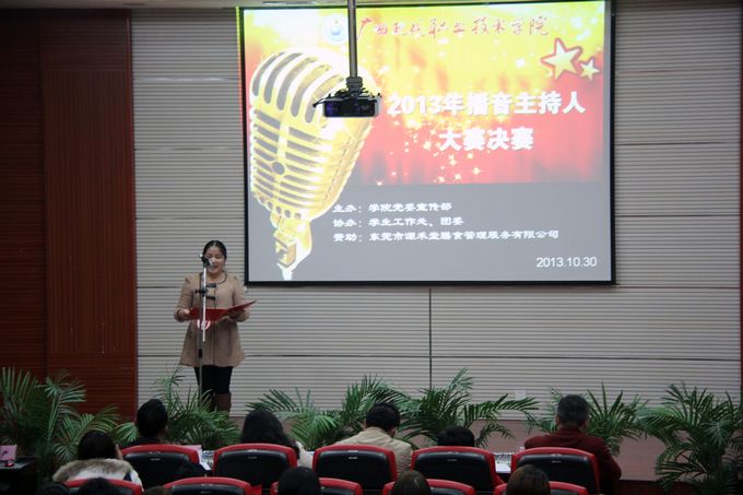 学院党委宣传部讯 为加强校园精神文明建设,活跃校园文化,丰富大学生的文化生活,充分挖掘富有潜质的播音员、主持人的新苗,展现广现职学子精神风貌,我院于10月30日晚在第二学术报告厅举行2013年播音主持人大赛决赛。大赛由学院党委宣传部、学工处、团委举办。学工处处长岑华、副处长李铃和团委副书记、学工处副处长黄仕珍出席大赛并担任评委。学院党委宣传部部长曾严应邀观看比赛。