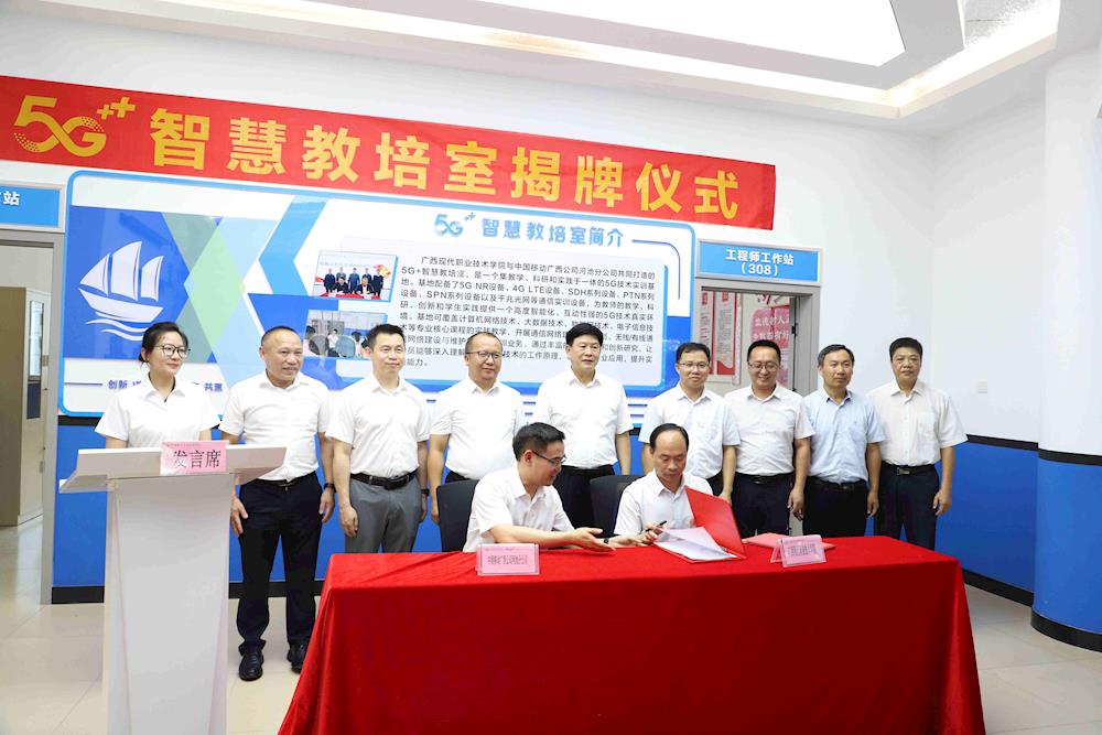 揭牌仪式上,信息工程学院颜增显院长介绍校企合作情况;举行5G教培室资产移交、移动公司捐赠仪式,刘勃兰、梁朝益作为双方代表签字;韦伟松、刘江为5G教培室揭牌。