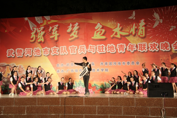 学院党委宣传部讯 为搭建驻河池武警官兵与地方青年交流平台,营造良好的拥军社会氛围。12月5日晚,由我院承办的“强军梦•鱼水情”武警河池支队官兵与驻地青年联欢晚会在学院文体广场举行。团河池市委书记杨胜涛,武警河池支队支队长练振波,团河池市委副书记杨哲、黄泽,学院院长助理韦胜东以及市直机关企事业单位团委负责人等出席了晚会。