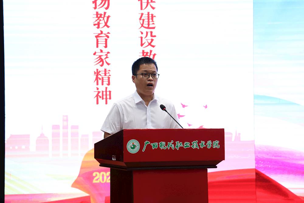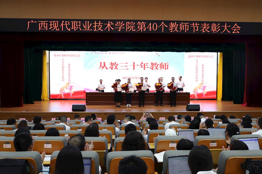 在第40个教师节即将到来之际,9月9日下午,我校在综合楼二楼东报告厅召开2024年教师节表彰大会,对2023—2024学年度在教育教学、管理服务、技能大赛、招生就业、科学研究、社会服务等工作中涌现出来的一批表现突出的先进集体和先进个人进行表彰,并为退休老教师举行光荣退休仪式。河池市政协副主席、学校党委书记韦伟松,党委副书记唐克胜,副校长黄耀、杨奎、梁朝益出席会议,全体教职工参加会议。会议由杨奎主持。