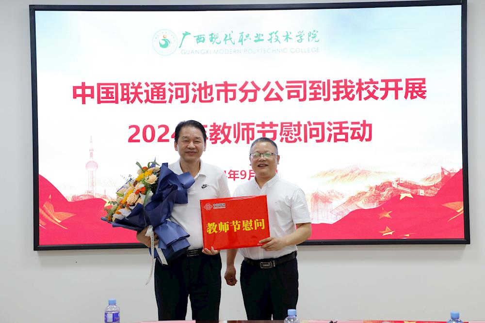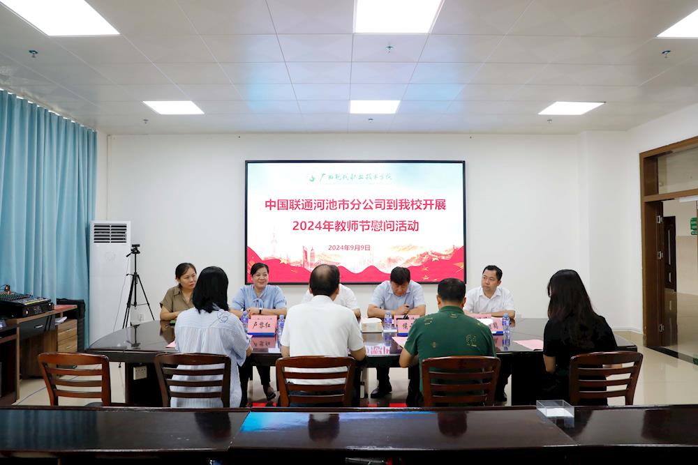中国联通河池市分公司总经理张吉辉一行到我校座谈交流并进行教师节慰问。黄绍光致欢迎辞,介绍学校的发展。张吉辉简述企业教育合作项目,向学校捐赠慰问品。