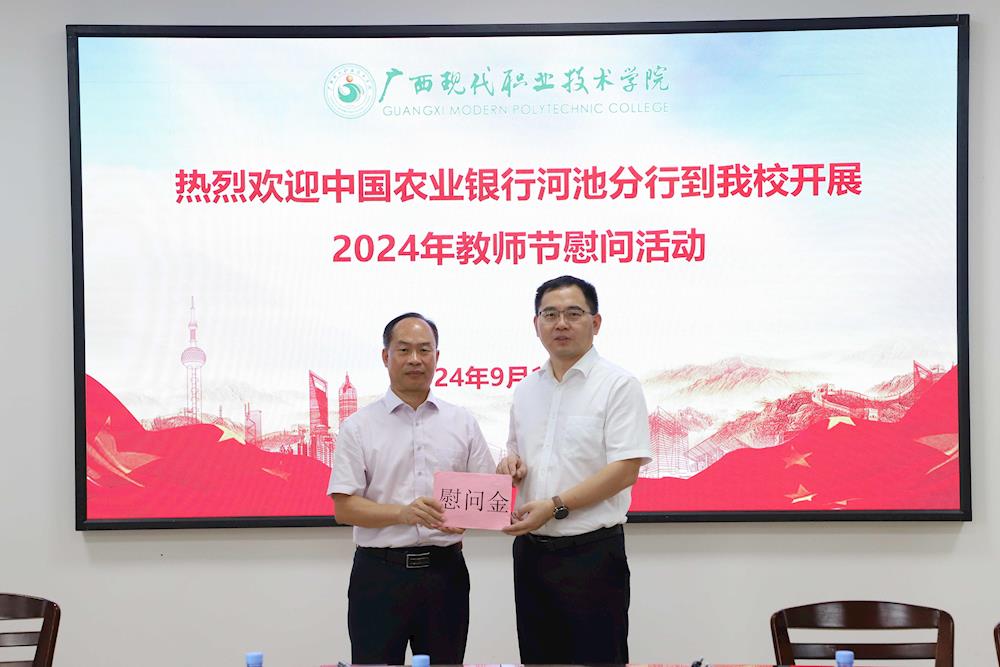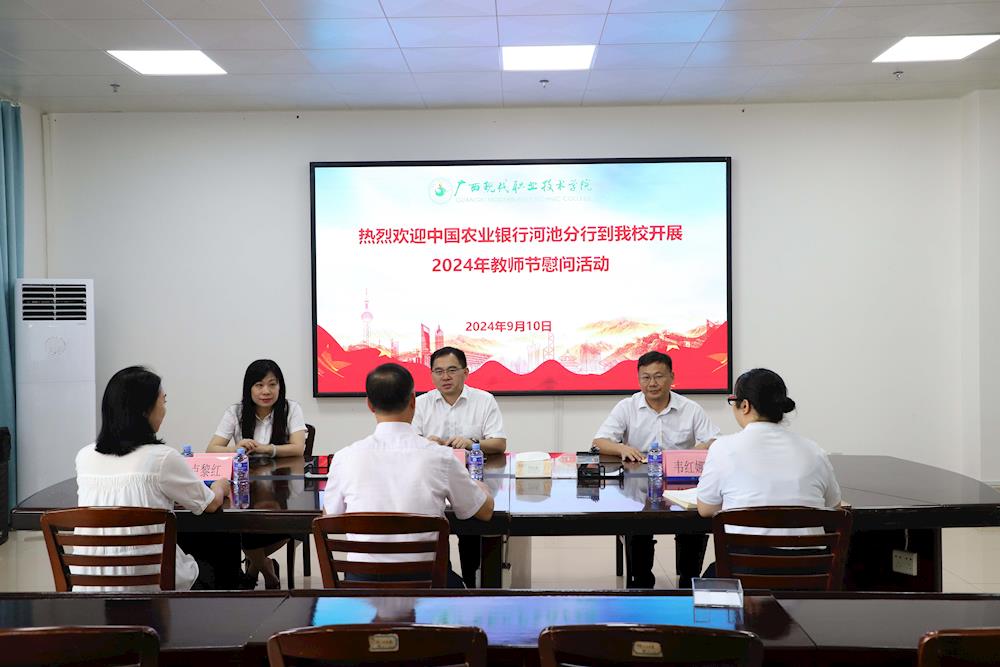 中国农业银行河池分行副行长谭兵一行到我校座谈交流并进行教师节慰问。梁朝益致欢迎辞,介绍学校的发展。谭兵简述企业教育合作项目,向学校捐赠慰问品,双方进行自由交流。