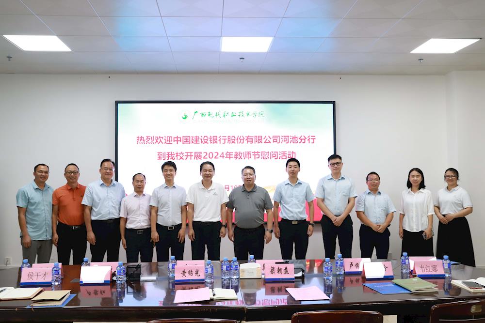 中国建设银行股份有限公司河池分行党委书记、行长黄晖一行到我校座谈交流并进行教师节慰问。黄绍光致欢迎辞,详细介绍学校的建设发展情况。黄晖简述企业教育合作项目,向学校捐赠慰问品。
